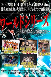 25-10-08 池袋Adm池袋Adm&助っ人集団☆石井ジャイアンツ合同企画ワールドシリーズ〜石井が生まれた日 名前はまだない〜 PLACE池袋Adm TIMEOPEN 18:30 / START 19:00 CHARGE前売り¥3,000 /当日¥3,500(共に1D別) WITH助っ人集団☆石井ジャイアンツGet bill monkeysHIRUGIチョメP INFO池袋Adm / 03-3983-9387 RESERVETIGET