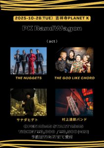 25-10-28 吉祥寺Planet KPK BandWagon PLACE吉祥寺Planet K TIMEOPEN 18:45 / START 19:15 CHARGE前売 ¥3,000 / 当日 ¥3,500(+1Drink) WITHTHE NUGGETSサナダヒデト村上達郎バンド INFO吉祥寺Planet K / 0422-21-7767 RESERVETIGET